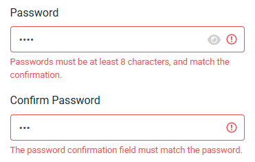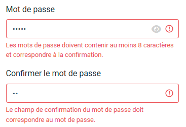 Correction de la validation des mots de passe : Nous avons amélioré la saisie des mots de passe. Désormais, lors de la création ou de la modification d’un utilisateur, si les exigences relatives au mot de passe ne sont pas respectées, le champ de saisie affichera une bordure rouge et un message d’aide, comme sur l’écran de réinitialisation du mot de passe. Ceci garantit un retour d’information cohérent pour toutes les actions de l’utilisateur.