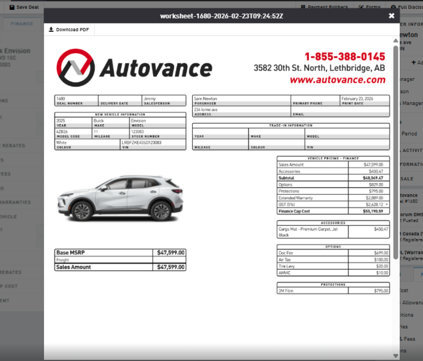 Build Options Worksheet – Vehicle Image Missing in Signed PDF: Fixed an issue where the vehicle image would display correctly when creating a Build Options worksheet, but would not appear in the generated PDF after the worksheet was signed. In these cases, the thumbnail shown in Notes & Activities and the opened signed PDF would display a version of the document without the vehicle image. This issue has been resolved so the vehicle image now appears correctly in the signed PDF and its thumbnail.