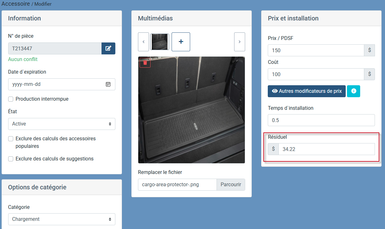 Champ résiduel pour les accessoires et ensemble customisés de concessionnaire : Nous avons étendu notre fonctionnalité de champ résiduel ! Auparavant, les valeurs résiduelles ne pouvaient être définies pour les accessoires EO par l'équipe chargée des données. Désormais, les concessionnaires peuvent également ajouter des valeurs résiduelles pour leurs accessoires et ensembles customisés directement au niveau concessionnaire.